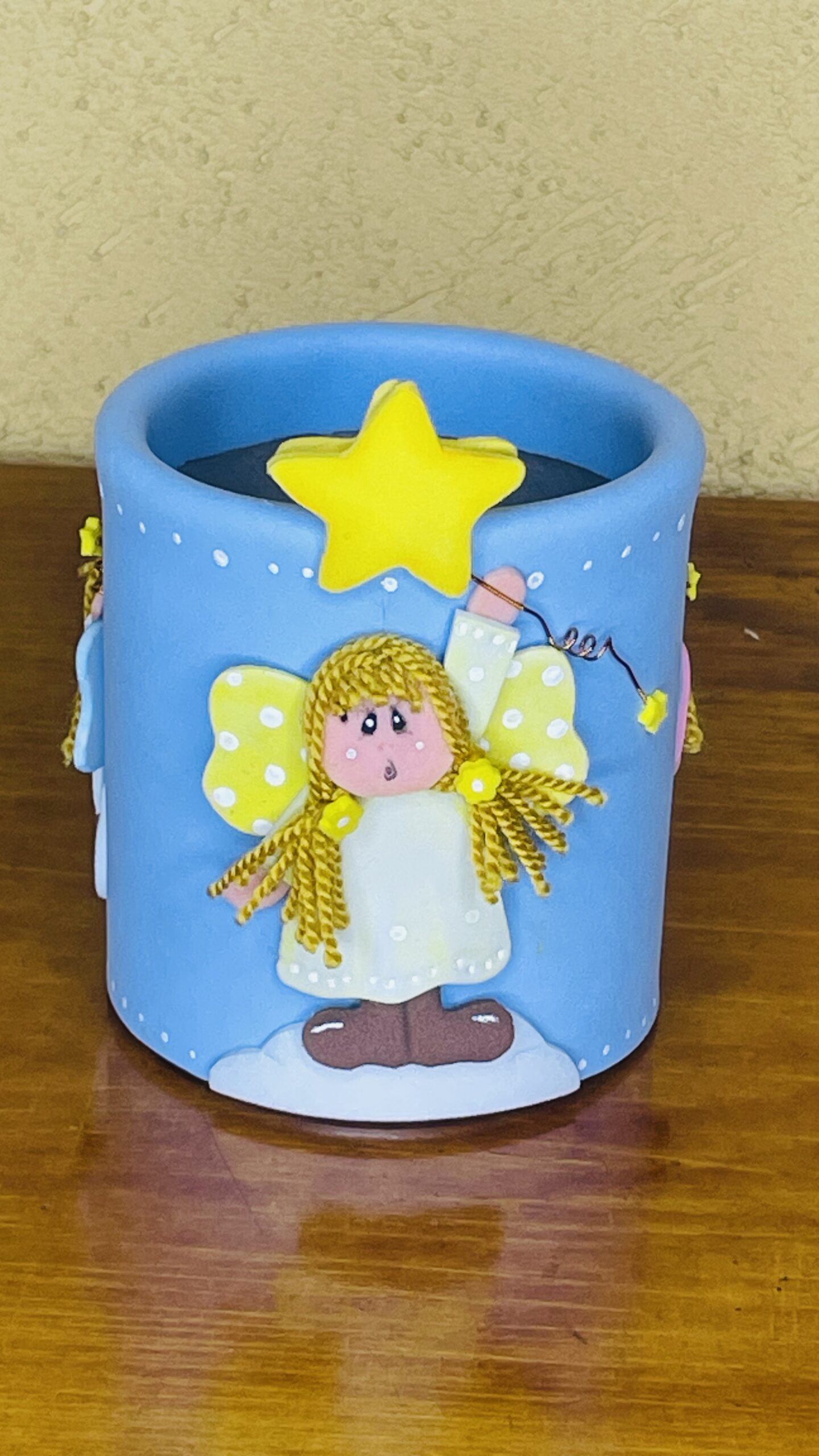 Portalápices hecho en goma eva sobre envase reciclado