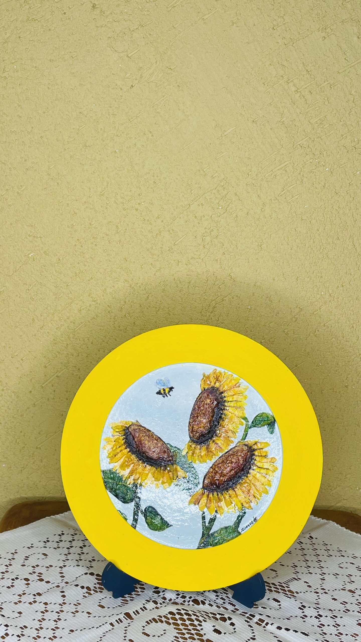 Cuadro decorativo con girasoles en alto relieve con técnica decoupage y pintado a mano.