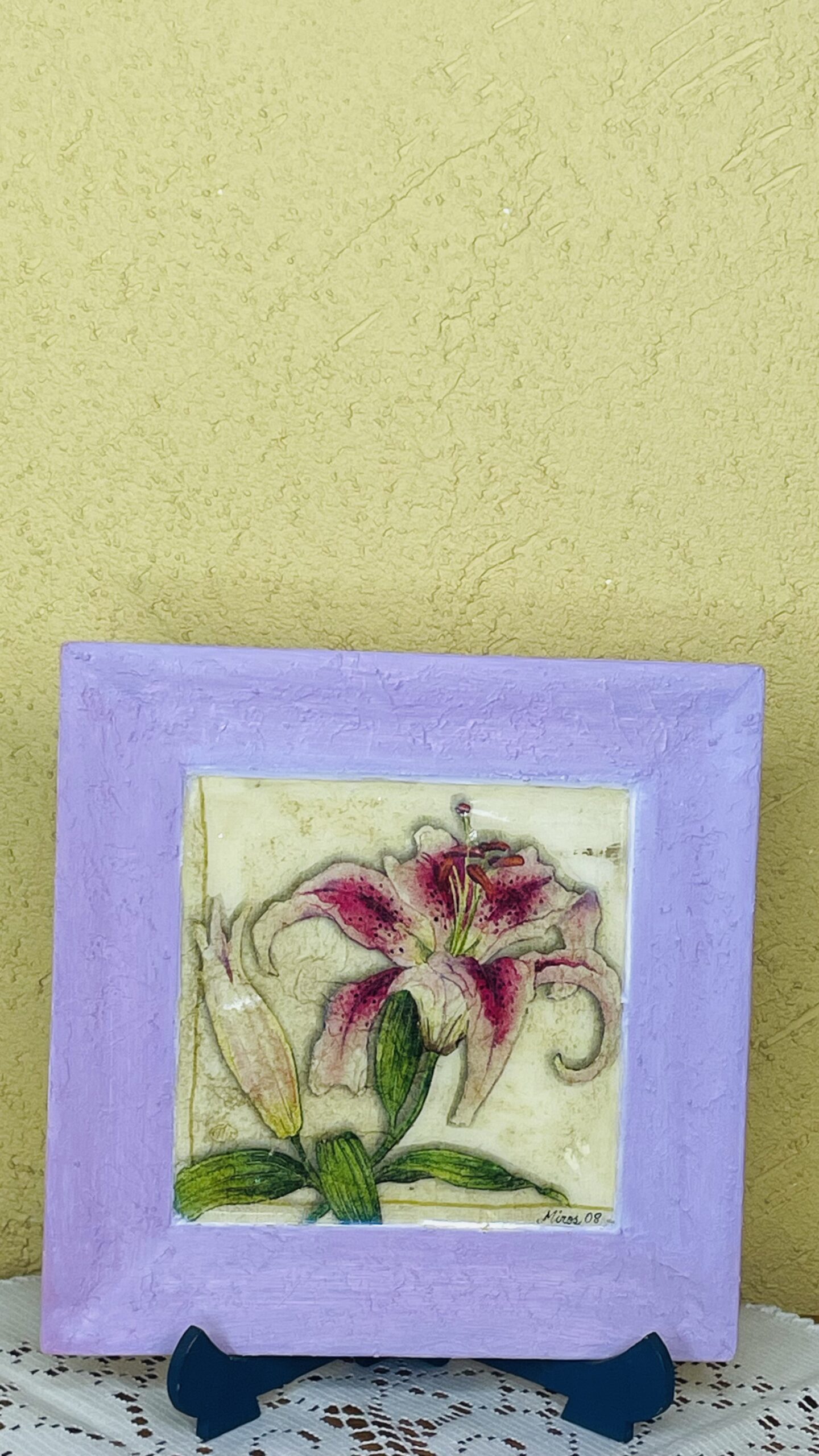 Cuadro decorativo con técnica de decoupage y resina color lila.